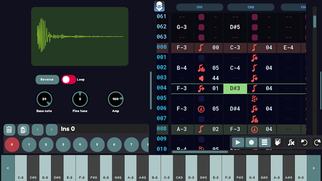 - Use the main tracker-like interface to place notes. Minimic auto detects the pitch of your sample so any musical sound you have recorded will be automatically in tune!
